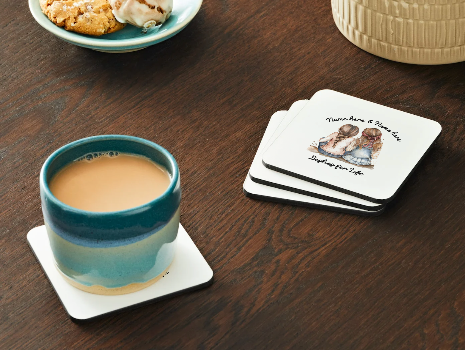 Presenting our personalizable/customizable "Besties for Life" coaster. This matches our inspirational mug of the same name. Customize it with your name and your best friend's name in a charming font that feels like a cozy hug each time you use it. Add the names in the customization boxes above. Max of 13 characters for each personalized name. Your name appears first as in the example photos.