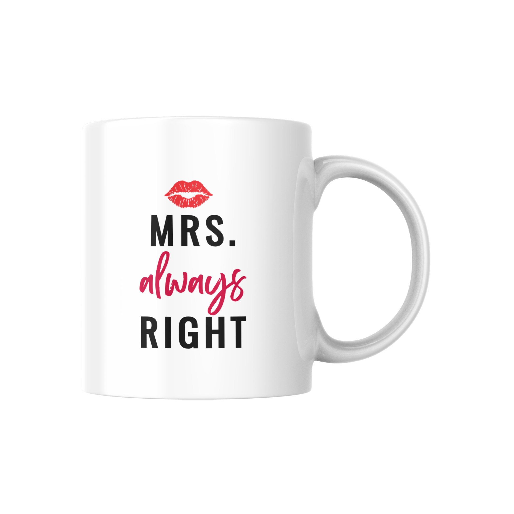 Each mug features a charming design: Mr. Right with a classy mustache and Mrs. Always Right with bold lipstick lips and playful typography. Itβs a fun, witty, and heartwarming way to share your morning coffee or tea β and to remind him who really runs the house! ππ