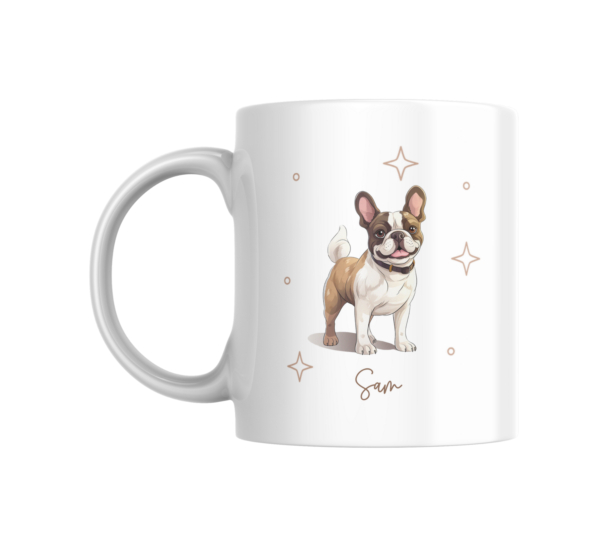 Custom, personalizable 12-ounce capacity white, ceramic mug. Cute graphic of the popular dog breed French bulldog with very subtle "stars and sparkle" in the background. Personalization, if wanted, in script-style font. Very understated, minimalist design. Will make for a great sentimental gift for any dog lovers.